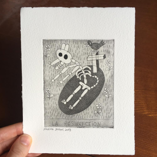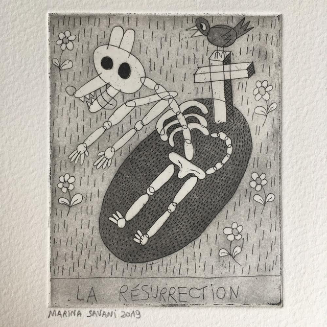 « La résurrection » est une gravure sur cuivre réalisée à l’eau forte (gravée et imprimée à la main), 16,5x13 cm, imprimée en seulement 5 exemplaires (chaque gravure est signée et numérotée)