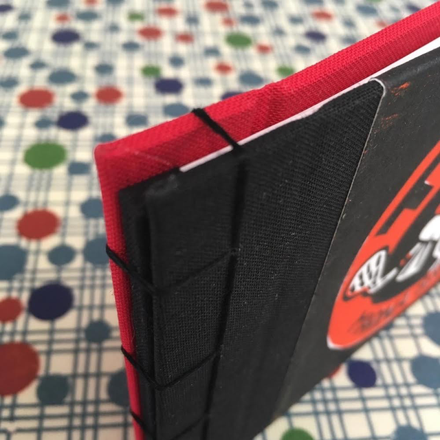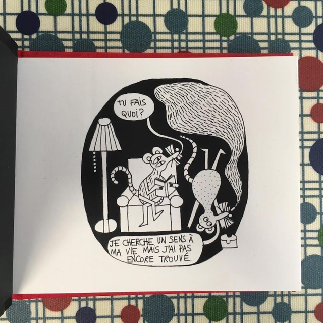 La couverture cartonnée est recouverte par une linogravure (gravée et imprimée à la main), 15x10 cm, la BD à l’intérieur est imprimée numériquement, et le livre est relié à la main par une reliure japonaise
